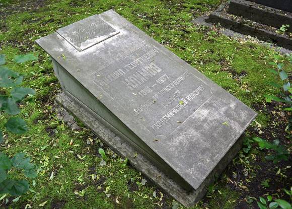 Объемно-пространственное и архитектурно-художественное решение:историческое местоположение захоронения и конфигурация надгробия; авторское надгробие в виде гранитной прямоугольной в плане профилированной надгробной плиты с наклонной верхней поверхностью, на прямоугольном в плане основании из известняка; рельефные символы, характер и содержание надгробных надписей.