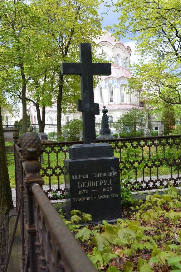 Объемно-пространственное и архитектурно-художественное решение:историческое местоположение захоронения, габариты и конфигурация надгробия (семейное захоронение); надгробие в виде креста из тёмного гранита на прямоугольнном в плане ступенчатом пьедестале и основании из тёмного гранита, на земляной площадке прямоугольного в плане подиума, ограниченного блоками из серого гранита с металлической оградой, выполненной в технике художественного литья (звенья ограды орнаментированные тремя поясами квадрифолий и фигурными прутьями, профилированные стойки квадратного сечения с навершиями в виде шишек с ананасной насечкой); характер и содержание надгробных надписей.