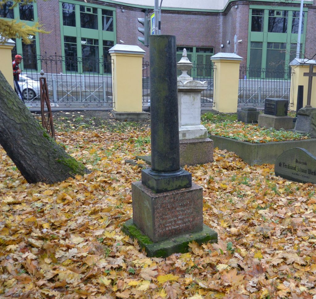 Объемно-пространственное и архитектурно-художественное решение:Местоположение, габариты и конфигурация участка;захоронения в границах участка (семейное место); архитектурно-художественное решение надгробия: полуколонна черного природного камня на гранитном постаменте и основании из известняка*;Надписи – содержание, характер (вырубка, окраска).*Завершение утрачено;