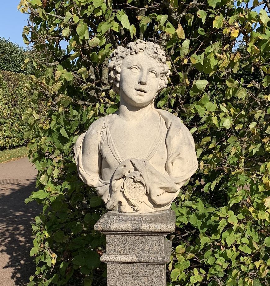 Объемно-пространственное и пластическое решение:аллегория «Мая» в виде подгрудного изображения мужчины с плащом на плечах и рокайльным медальоном с изображением зодиакального знака «Близнецы», с венком из цветов и листьев;нач. XVIII в., скульптор Д. Бонацца, сер. XVIII в.,белый мрамор.