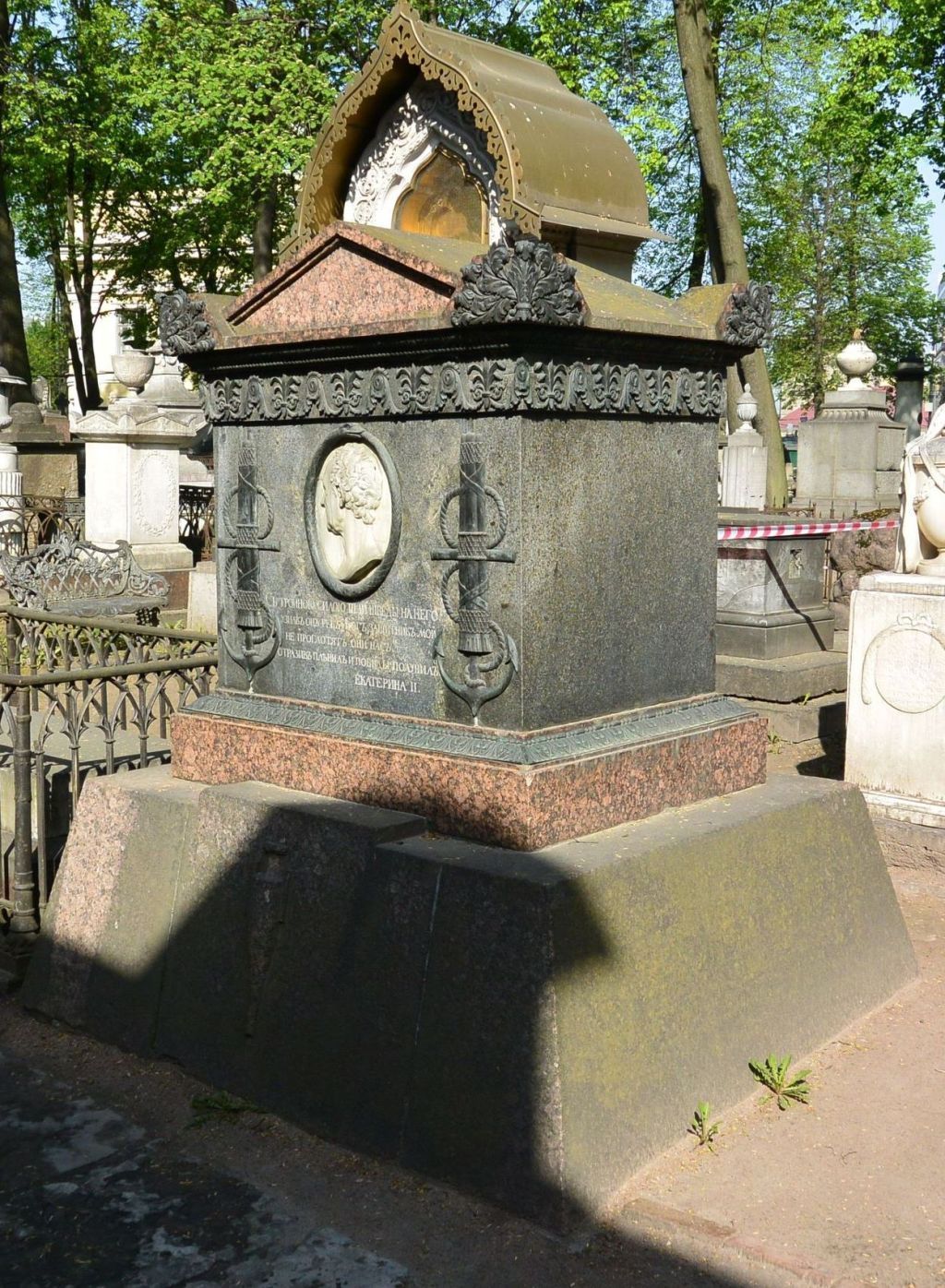 Объемно-пространственное и архитектурно-художественное решение: местоположение захоронения, габариты и конфигурация надгробия; историческое художественное решение надгробия: гранитный жертвенник, декорированный бронзовым растительным орнаментом во фризе и акротериях и символическими изображениями, мраморным портретным и металлическим геральдическим рельефными медальонами; характер и содержание надгробной надписи.
