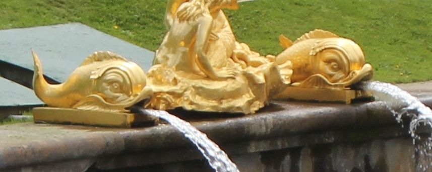 четыре фонтанные фигуры «Дельфин» (бронза, литье, чеканка, золочение), установлены на прямоугольном плинте, на бортах Ковша по две у каждой группы «Сирен», пасть открыта, в нее установлена фонтанная трубка, от верхней губы идут стилизованные плавники, с обеих сторон головы плавники, туловище изогнуто влево, на спине трехлопастной плавник, хвост изогнут вправо, поднят над основанием.