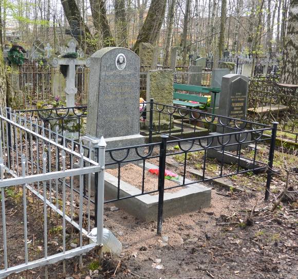 Объемно-пространственное и планировочное решение территории: историческое местоположение в западной части Серафимовского кладбища (участок 14-3), конфигурация участка (№ 14 на схеме);захоронения в границах участка. Объемно-пространственное и архитектурно-художественное решение:габариты, конфигурация и объёмно-пространственное решение надгробия в виде прямоугольной в плане вертикально поставленной сужающейся кверху ступенчатой стелы из серого гранита с округлым завершением и примыкающим цветником, ограниченным бетонным поребриком (надгробие расположено на земляной площадке, ограниченной невысокой металлической оградой, в верхней части лицевой поверхности стелы расположено портретное изображение на фото-эмали, ниже вырублены и тонированы под золото контррельефные буквенные литеры надгробной надписи); содержание и характерные особенности надгробной надписи.