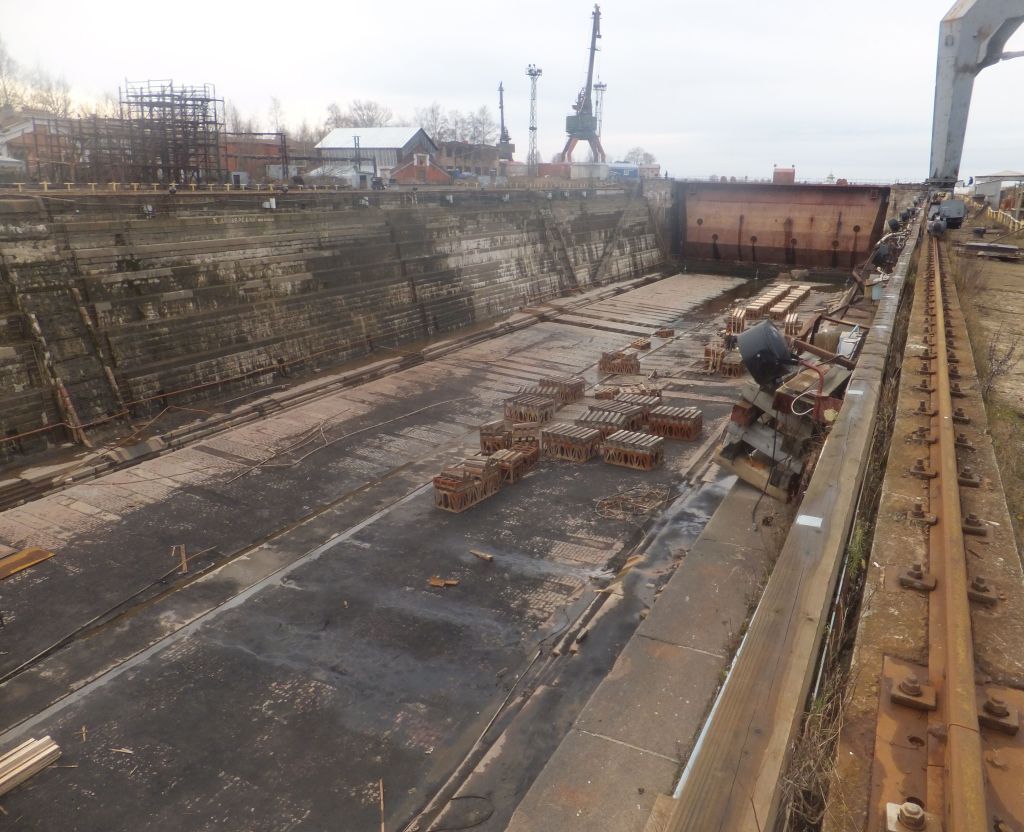 Объемно-пространственное решение:исторические габариты и конфигурация прямой камеры дока с закругленной восточной частью включая:симметрично наклонный к центру флютбет (дно) дока с кюветами по центру;наклонные ступенчатые боковые подпорные стенки камеры со спускными лестницами, грузоспусками и со ступенчатым, закругленным в торцах основанием завершающиеся примыкающей бермой;восточную закругленную торцевую стенку со спускными лестницами и грузоспуском;выступающие устои с примыкающими спускными лестницами, формирующие внешние причальные стенки гавани, фланкирующие камеру дока, шлюз с затвором в западной части камеры дока;историческое местоположение и габариты водоподводящей системы дока в виде галерей в южной стенке и восточной части дока, клинкетов в затворе и исторических гидротехнических и подъемных механизмов;объекты культурного наследия, расположенные на территории объекта: выявленный объект культурного наследия «Водоподъемная станция при доке Велещинского», входящего в ансамбль «Служебные постройки при доках» выявленного объекта культурного наследия «Постройки Кронштадтского пароходного завода».Конструктивная система: исторический материал облицовки и конструкции флютбета, подпорных и торцевой стенок камеры со ступенчатым основанием, устоев в восточной части камеры и причальных стенок–блоки из природного камня (облицовка подпорных и торцевой стенок и флютбета), блоки и плиты из гранита (материал облицовки ступенчатых краев, площадок и завершения подпорных стенок, краев кюветов флютбета, материал основания подпорных стенок, площадок устоев восточной части дока, облицовка стен устоев в восточной части камеры дока и причальных стенок);спускные лестницы торцевой стенки камеры дока и устоев восточной части дока - местоположение, габариты, тип (маршевые), материал ступеней и обкладки лестниц – плиты из гранита;материал ограждения лестниц – металл;исторический материал облицовки шлюза и затвора – блоки из гранита (облицовка шлюза и порога затвораа), металл (материал затвора);исторический материал гидротехнических механизмов, кабестанов, кнехтов на берме вдоль камеры дока, на краях шлюза и затвора и усиления завершения камеры дока – местоположение, материал (металл);исторические швартовочные кольца на устоях восточной части камеры дока – местоположение, габариты, материал (металл).