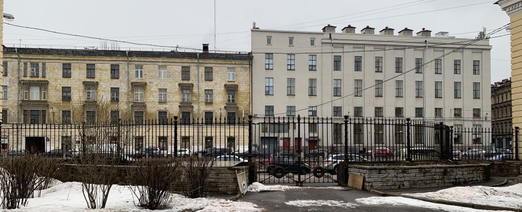 Объемно-пространственное решение:металлическая ограда на высоком кирпичном цоколе, состоящая из центральных двустворных ворот и вытянутых секций из пик с опорными стойками (по четыре из каждой стороны), образующих вогнутую в сторону двора дугу. Архитектурно-художественное решение:цоколь, облицованный известняковой скобой;восемь металлических секций из завершенных пиками прутьев, орнаментированных в нижней части, и девяти чугунных опор круглого сечения в виде каннелированных колонн, перевитых гирляндами и завершенных чашами;двустворные ворота: в верхней части каждой створки прутья, аналогичные прутьям секций, нижняя часть створок декорирована перекрещенными жезлами с шишками пинии и орнаментированными венками; верхняя часть места соединения створок декорирована шишкой пинии.