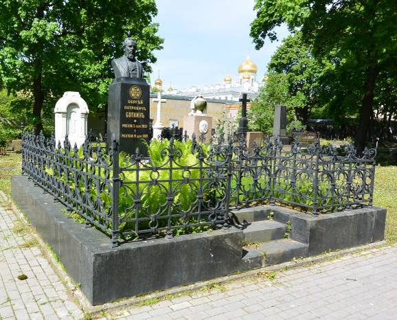 Объемно-пространственное и архитектурно-художественное решение:историческое местоположение захоронения, габариты и конфигурация надгробия (семейное захоронение); авторское архитектурно- художественное решение надгробия в виде портретного бронзового бюста на высоком пьедестале из чёрного полированного гранита внутри подиума ограниченного поребриком из блоков чёрного полированного гранита со ступенями и металлической кованой оградой (рисунок ограды – вертикальные прутья и стойки, декорированные волютами, пиками, квадрифолиями); рельефные символы, характер и содержание надгробных надписей.