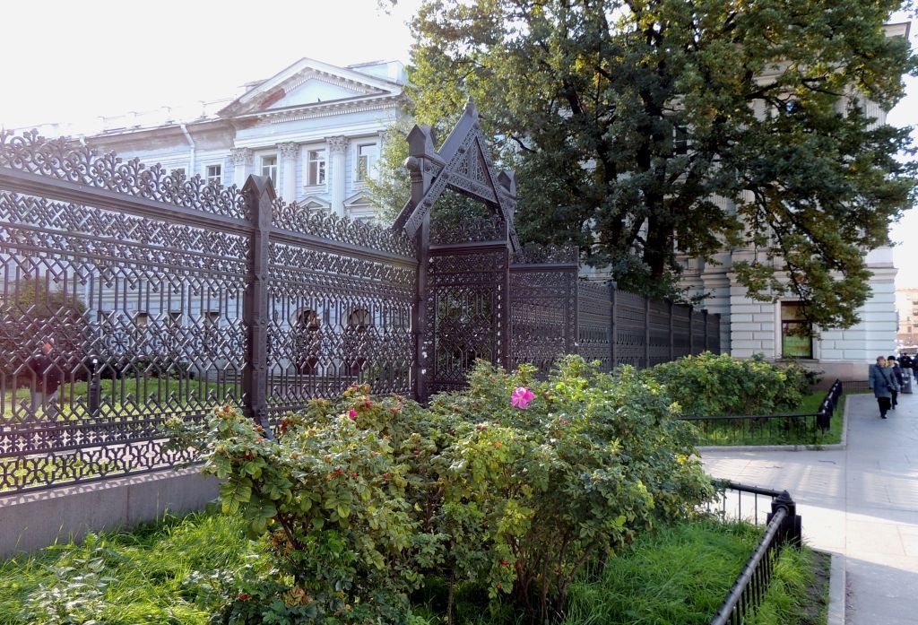 Ограда садаСанкт-Петербург, Лиговский пр., 60-62Объемно-пространственное решение:местоположение ограды - со стороны Лиговского проспекта, вдоль западной границы территории сада; габариты и конфигурация ограды с воротами.Конструктивная система:конструктивное решение: звенья ограды и створы ворот с перемычкой на литых чугунных стойках, на гранитном цоколе.Архитектурно-художественное решение:архитектурно-художественное решение в приемах историзма («псевдорусский» стиль) предположительно по рисункам И. И. Горностаева; материал, техника исполнения ограды: цоколь тесаного розового гранита, звенья ограды, ворота с перемычкой, несущие стойки – чугунного литья; звенья – ажурные, с мотивом плетенки, с ажурным «подзором» из крестоцветов над верхней тетивой; опорные стойки, поддерживающие звенья ограды, и стойки, несущие створы ворот - чугунного литья, прямоугольного (квадратного) сечения, с восьмискатными завершениями; створы ворот по рисунку аналогичны звеньям – ажурные с мотивом плетенки и ажурным «подзором» над верхней тетивой; перемычка ворот с навершием решена в форме треугольного фронтона, с имитацией деталей деревянной архитектуры (причелин и полотенец).