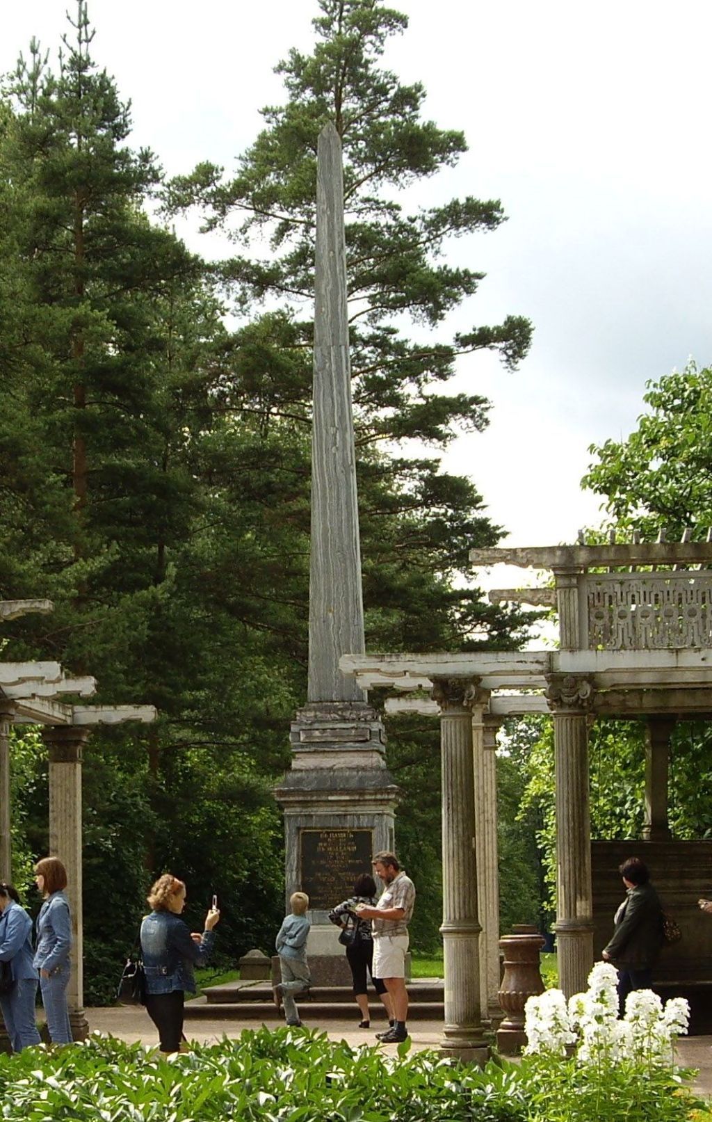 Объемно-пространственное и планировочное решение территории: местоположение западнее Собственного сада у Зубовского флигеля Екатерининского дворца.Объемно-пространственное решение:обелиск на пьедестале, установленном на гранитном ступенчатом стилобате;ограждение в виде гранитных круглых в сечении столбиков, соединенных металлическими цепями. Архитектурно-художественное решение:архитектурно-художественное решение в формах классицизма; материалы обелиска и постамента - серый с прожилками мрамор, плинт под обелиском со вставками тивдийского розового мрамора; стилобат и цоколь пьедестала – красный гранит; доска с надписью – бронза;узкий четырехгранный обелиск на ступенчатом плинте, декорированном квадрами «алмазного» руста; пьедестал квадратный в плане с прямоугольными филенками по четырем сторонам, и профилированными карнизом в завершении, на цоколе красного гранита;бронзовая доска с надписью (в филенке, обращенной в сторону дворца): «В память победы при реке Кагуле в Молдавии, июля 21 дня 1770 года, под предводительством генерала графа Петра Румянцова Российское воинство числом семнадцать тысяч обратило в бегство до реки Дуная турскаго визиря Галиль-Бея с силою полутораста тысячною».