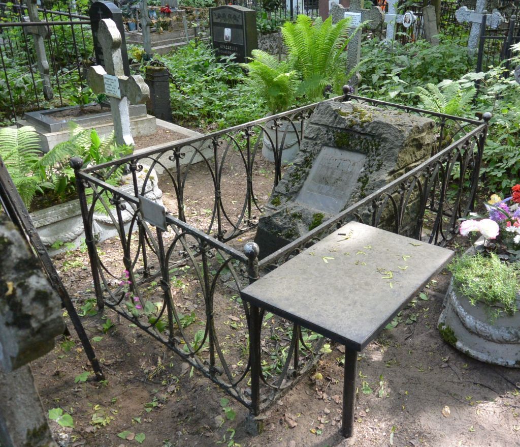 Объемно-пространственное и планировочное решение территории: историческое местоположение и конфигурация семейного участка (№ 38 на схеме); захоронения в границах участка.Объемно-пространственное и архитектурно-художественное решение:историческое архитектурно-художественное решение захоронения (прямоугольная в плане стела-обелиск из красного гранита на двухступенчатом основании с цветником ограниченным гранитным поребриком внутри металлической ограды, в верхней части лицевой поверхности обелиска размещался, ныне утраченный, бронзовый барельефный портрет изображение); характер и содержание надгробной надписи.