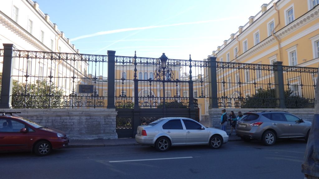 Объемно-пространственное решение: местоположение (по красной линии набережной реки Фонтанки), габариты, конфигурация; состоит из трех частей: центральная – решетка на цоколе (ограждает курдонер) и боковые –глухая ограда (ограждает дворы).Конструктивная система: опорные стойки с секциями и воротами; глухая ограда с воротами.Архитектурно-художественное решение: центральная часть:чугунная решетка на цоколе, облицованном известняком;состоит из ряда опорных стоек и секций между ними;стойки: в виде пилонов с профилированными филенками с литьем геометрического рисунка и капителями с иоником;секции: между четырьмя фигурными балясинами, декорированными волютами, вертикальные гладкие прутья круглого сечения; по верхнему и нижнему поясу ажурные фризы из волют и рокайлей;ворота – местоположение, габариты, конструкция (двухстворчатые), оформление (верхняя часть идентична оформлению секций, в центральном поле – композиция из волют и фигурной балясины с шестигранным фонарем; нижняя часть ворот – с ажурным рисунком из выкружек и волют);боковые части:вид материала отделки цоколя – известняк;вид материала и характер отделки фасада – окрашенная рустованная штукатурка,оформление стен – гладкие пилястры, профилированные филенки, профилированная тяга, профилированный венчающий карниз;воротные проемы местоположение, габариты, конфигурация (с лучковым завершением), оформление (профилированные наличники, веерный руст); заполнение воротных проемов – материал (дерево), конструкция (ворота двухстворчатые), оформление (профилированные филенки);воротные приборы – материал (металл), форма (накладные личины овальной формы с круглыми кольцами).