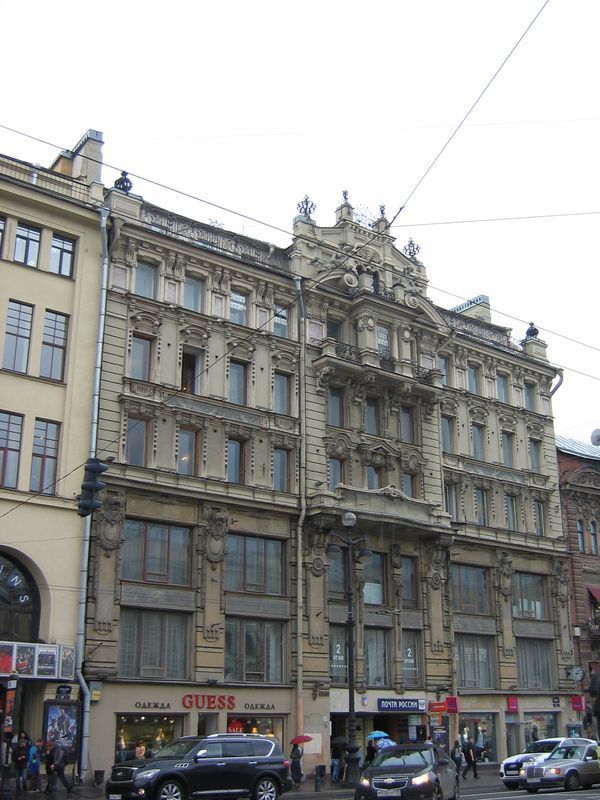 Объемно-пространственное решение:исторические (здесь и далее под термином «исторические» следует понимать датировку на 1908 г.) габариты и конфигурация трапециевидного в плане, шестиэтажного на подвалах здания с мансардой и двумя сложными в плане дворами;два прямоугольных в плане воротных проезда, северный перекрыт пологим сводом, южный имеет плоское перекрытие;форма, габариты и конфигурация крыш, в том числе габариты и архитектурное решение мансарды; высотные отметки коньков крыш.Конструктивная система:наружные и внутренние капитальные стены (кирпичные);исторические отметки междуэтажных перекрытий;междуэтажные перекрытия в помещениях с художественной отделкой; своды перекрытий:пологий коробовый свод северного воротного проезда;своды Монье: в основании площадок лестницы 4ЛК; в подвальных помещениях (в том числе – 1-Н и 2-Н);лестничные клетки и вестибюли, их объемно-планировочное решение:парадная лестница 1ЛК;вход организован со стороны Невского проспекта – двухмаршевая, на косоурах, ступени выполнены из светло-серого мрамора;металлическое кованое ажурное ограждение выполнено в виде широкого фриза из овалов, декорированных стилизованными листьями и розетками, обрамленного меандром (по нижней границе) и орнаментальным поясом «волна» (по верхней границе), под деревянным профилированным поручнем;вход организован со стороны западного и восточного дворовых фасадов;служебные лестницы – 2ЛК и 3ЛК (вход организован со стороны западного и восточного дворовых фасадов):двухмаршевые на косоурах, в основании площадок – прусские своды, ступени выполнены из лещадной плиты;металлическое ограждение выполнено в виде круглых в сечении стоек под металлическим поручнем;служебная лестница 4ЛК (вход организован со стороны северного дворового фасада);двухмаршевая на косоурах, в основании площадок – своды Монье, ступени выполнены из лещадной плиты;кованое ограждение под деревянным профилированным поручнем с цветочным орнаментом;одна ступень из красного гранита.Объемно-планировочное решение:объемно-планировочное решение лестничных клеток, их вестибюлей и помещений с декоративно-художественной отделкой, указанных в п.5.Архитектурно-художественное решение фасадов:лицевой фасад, лицевого корпуса, выходящий на красную линию застройки Невского проспекта, шириной в одиннадцать осей, решен в приемах эклектики;цоколь облицован плитами красного гранита;характер отделки фасада: оштукатурен, окрашен, в уровне второго и третьего этажей, а также пилястры в уровне четвертого-пятого этажей – руст угловых лопаток и лопаток центрального ризалита, филенчатые вставки из натурального камня (зеленый мрамор) в подоконных пространствах между вторым и третьим этажами и четвертым и пятым этажами (в левой и правой части), филенчатые вставки из натурального камня в межоконных пространствах шестого этажа (известняк?);центральная часть фасада шириной в три световые оси незначительно выступает относительно боковых, в уровне первого этажа акцентирована прямоугольным проемом, объединяющим воротный проезд, перекрытый пологим сводом и прямоугольный дверной проем парадной лестницы;декор перекрытия профилированными панелями (над дверным проемом, над пилоном и над воротным проездом);пилон, декорированный стилизованной каннелированной пилястрой то