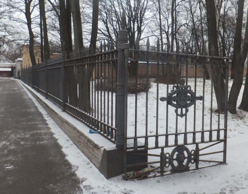 Объемно-пространственное решение:местоположение, габариты и конфигурация ограды на цоколе с одними воротами по крайней восточной части отделяющая южную границу сада по Макаровской улице до канала Петровского дока.Конструктивная система:историческая конструкция ограды, включая: цоколь – местоположение, габариты, конфигурация (прямоугольная в профиле), материал (блоки из известняка); навершие и заполнение ограды – конструкция (опорные столбы, с горизонтальными направляющими и вертикальными стойками);местоположение, габариты, материал (металл), техника исполнения (литье); ворота – тип (двустворчатые с одностворчатой калиткой), конструкция (створки ворот и калитки); местоположение, габариты, материал (металл), техника исполнения (литье).Архитектурно-художественное решение: навершие ограды – оформление и рисунок:опорные столбы в виде стилизованных фасций с двойными топориками в верхней части и завершением в виде стилизованного навершия копья; горизонтальные направляющие квадратного сечения и вертикальные фигурные стойки с завершениями в виде пик;ворота – оформление створок ворот и калитки- круглые медальоны между вертикальными стойками;композиция в виде стилизованных соединенных щита, меча и якоря в центральной части створок;композиция в виде геометрического орнамента с львиным маскароном в центре в основании створок.опорные столбы в виде стилизованных фасций с двойными топориками в верхней части и завершением в виде стилизованного навершия копья; горизонтальные направляющие квадратного сечения и вертикальные фигурные стойки с завершениями в виде пик;ворота – оформление створок ворот и калитки- круглые медальоны между вертикальными стойками;композиция в виде стилизованных соединенных щита, меча и якоря в центральной части створок;композиция в виде геометрического орнамента с львиным маскароном в центре в основании створок.