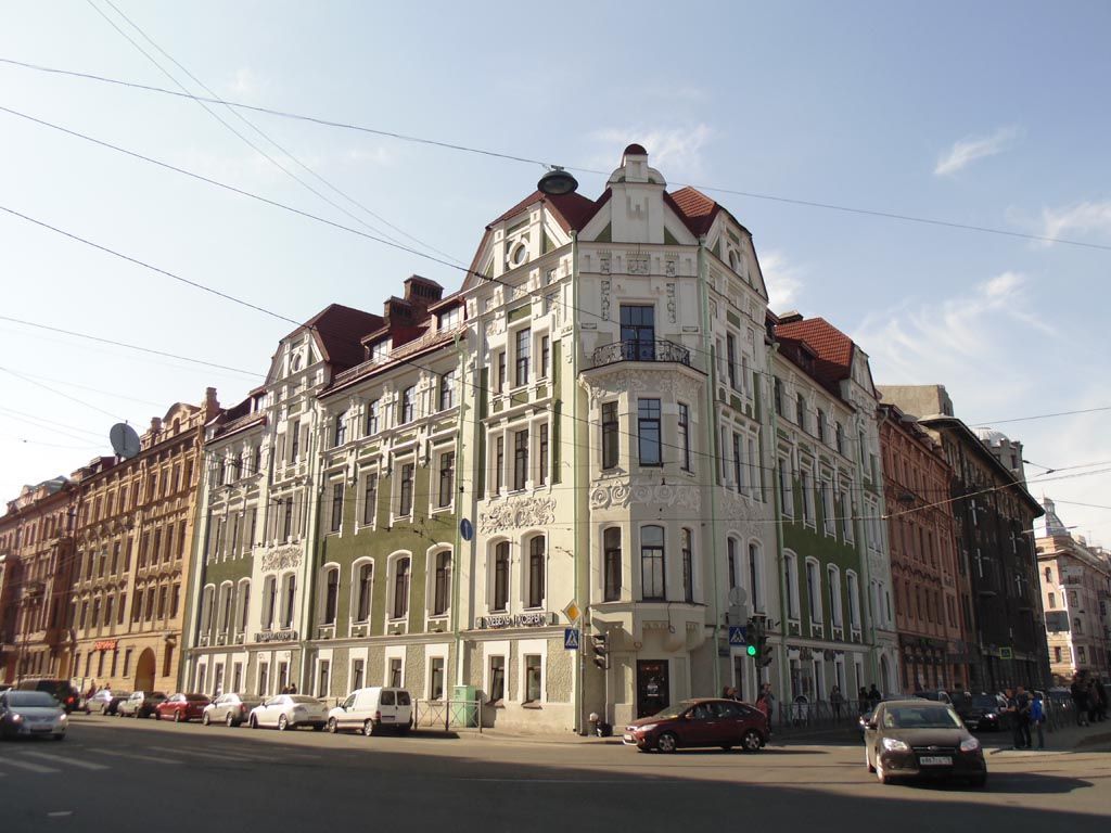 Объемно-пространственное решение: исторические габариты и конфигурация здания, состоящего из четырехэтажных лицевых с историческими мансардами и дворовых корпусов;исторический воротный проезд – местоположение (по 7-й световой оси лицевого фасада со стороны пр. Добролюбова),конфигурация (полуциркульный), габариты; крыши – исторические габариты и конфигурация (многоскатная, сложной конфигурации, полувальмовая) лицевых скатов лицевых корпусов, включая дымовые трубы с орнаментами выпущенного кирпича, исторический материал окрытия крыш исторических мансард лицевых скатов лицевых корпусови верхней части труб (металлическая черепица). Конструктивная система:исторические наружные и внутренние кирпичные капитальные стены; междуэтажные перекрытия – местоположение; полуциркульный с распалубками (воротный проезд по 7-й световой оси со стороны пр. Добролюбова); лестница – местоположение (по 13-й световой оси лицевого фасада со стороны Кронверкского пр.), конструкция (на косоурах), тип и конфигурация (двухмаршевыйс забежными ступеньками), материал ступеней (лещадная плита); ограждение лестницы – материал (металл), техника (ковка), рисунок (вертикальные стойкис волютообразными завитками); поручень – деревянный профиль; лестница – местоположение (по центральной световой оси со стороны Кронверкского пр.), конструкция (консольно заведенные в стену), тип и конфигурация (двухмаршевый), материал ступеней (лещадная плита); лестница – местоположение (из воротного проезда, со стороны пр. Добролюбова), конструкция (на косоурах), тип и конфигурация (двухмаршевая), материал ступеней (лещадная плита); ограждение лестницы – материал (металл), техника (ковка), рисунок (вертикальные стойки); поручень – деревянный профиль; лестница – местоположение (по 1-й световой оси лицевого фасада со стороны пр. Добролюбова), конструкция (на косоурах), тип и конфигурация (трехмаршевая), материал ступеней (лещадная плита); ограждение лестницы – материал (металл), техника (ковка), рисунок (вертикальныестойкис волютообразными завитками); поручень – деревянный профиль; Объемно- планировочное решение: историческое объемно-планировочное решение в габаритах кирпичных капитальных стен. Архитектурно- художественное решение фасадов:лицевые фасады: материал и характер отделки цоколя - облицовка известняковыми плитами; материал и характер отделки фасадной поверхности - ленточный руст гладкой штукатурки на уровне 1-го этажа, штукатурка «под шубу» на уровне 1-го этажа угловой части и примыкающих к ней частей здания, штукатурка «внабрызг» и гладкая штукатурка); четыре ризалита: увенчанные мансардами с окнами-люкарнами; на третьем и четвертом этажах с тройными окнами; в верхней части декорированы стилизованными машикулями и филенками с лепным цветочным орнаментом в характере модерна (два из них фланкируют угловой объем); трехгранный в плане эркер на стилизованных кронштейнах – в уровне 3-4-го этажей; фигурный щипец, венчающий угловой объем, с декором в виде стилизованных машикулей и с поясом дентикулов; межэтажный карниз на уровне 1-2-го этажей; подоконный профилированный карниз на уровне четвертого этажа с филенчатым поясом и прямоугольными консолями; местоположение,габариты и конфигурация оконных проемов; исторический рисунок расстекловки (с фрамугами на три стекла у