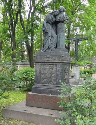 Объемно-пространственное и архитектурно-художественное решение:историческое местоположение захоронения и конфигурация надгробия; авторское художественное решение надгробия в виде портретного бюста на цилиндрическом пьедестале с приникшей к нему полноразмерной фигурой скорбящей музы с нотным свитком и венком в руках, композиция расположена на профилированном прямоугольном в плане пьедестале, декорированном рельефами символического характера, на двухступенчатом основании из красного гранита и прямоугольном в плане подиуме из красного гранита (ограда утрачена); рельефные символы, характер и содержание надгробных надписей.