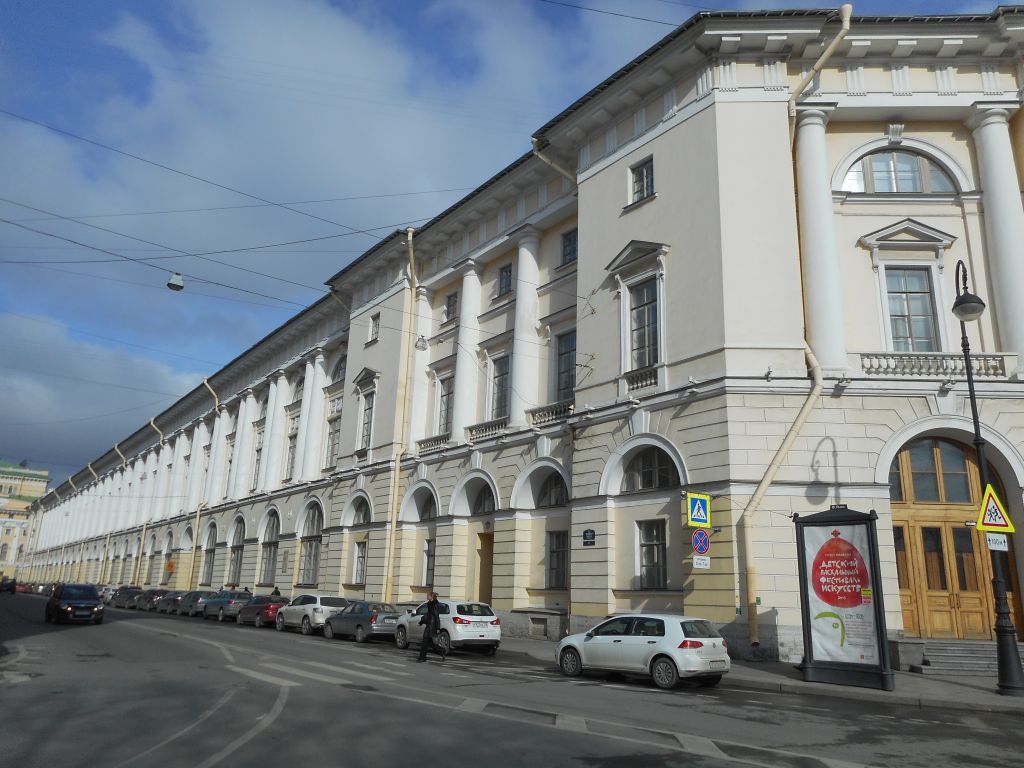 Объемно-пространственноерешение:Габариты и конфигурациясложного в плане здания,включающего лицевые 3-х-этажные с антресолями, наподвалах корпуса, дворовыефлигели и корпуса, с дворовойтерриторией и воротнымипроездами;крыши лицевых и дворовыхкорпусов – габариты иконфигурация (скатные),материал окрытия (листовойметалл) и его цвет (порезультатам историческихисследований);боковые ризалиты в угловыхчастях лицевых корпусов;полуциркульный в планелестничный ризалит –местоположение (южный,дворовый фасад лицевогокорпуса по пл. Островского),габариты;два ступенчатых,прямоугольных в плане ризалитас небольшими эркерами вуровне 3-го этажа –местоположение (по восточномуфасаду восточного дворовогофлигеля), габариты;воротные проемы –местоположение (в 17-ой и 24-ойсветовых осях лицевого фасадапо ул. Зодчего Росси),конфигурация (сполуциркульным завершением),габариты;воротные проезды восточногодворового флигеля –местоположение, конфигурация(с лучковым завершением),габариты.Конструктивнаясистема здания:Исторические наружные ивнутренние кирпичныекапитальные стены XIX века;междуэтажные перекрытия, втом числе по деревянным иметаллическим балкам –местоположение;своды:цилиндрические, крестовые,коробовые с распалубками наподпружных арках (воротныепроемы и проезды);крестовые; илиндрические, в том числе сраспалубками;коробовые, в том числе сраспалубками; система сводов подвальногоэтажа, в том числе опирающиесяна прямоугольные в сечениипилоны;система цилиндрических сводов,включая своды с распалубками,опирающиеся на пилоны; сомкнутый с распалубками;ползучие;исторические лестницы(местоположение,конфигурация, тип,конструкция, габариты,материал ступеней, площадок иограждения), в том числе:многомаршевая лестница вюжной части лицевого корпусапо ул. Зодчего Росси, с маршамипо ползучим сводам, сизвестняковыми ступенями,латунными кольцами иковродержателями;металлическое литое лестничноеограждение из секцийвертикальных прутьев сажурными овальнымимедальонами, со стилизованнымцветочным орнаментом ирозетками в центре, склиновидным завершением иверхним горизонтальнымпоясом из пальметт, сдеревянными поручнями, свнешними поддерживающимиэлементами в виде консолей срастительным рисунком и спрямоугольными в сечении,оштукатуренными угловымистолбиками;световой фонарь лестницы –прямоугольный в плане,конструкция, габариты, рисунокрасстекловки; трехмаршевые лестницы – напилонах, с маршами поползучим сводам, с площадкамипо коробовым с распалубкамисводам, межуровневымиплощадками по крестовымсводам, с известняковымиступенями и межуровневымиплощадками, с латуннымикольцами и ковродержателями, свнутренним (между пилонов)ограждением из секцийвертикальных прутьев сажурными овальнымимедальонами, со стилизованнымцветочным орнаментом ирозетками в центре, склиновидным завершением,верхним горизонтальнымпоясом из пальметт идеревянными поручнями;двухмаршевые лестницы смаршами по косоурам, слестничными площадками покоробовым, коробовым сраспалубками и крестовымсводам с известняковымиступенями и площадками;металлическое литое лестничноеограждение, в том числе изсекций вертикальных прутьев сажурными овальнымимедальонами, со стилизованнымцветочным орнаментом ирозетками в центре, склиновидным завершением иверхни