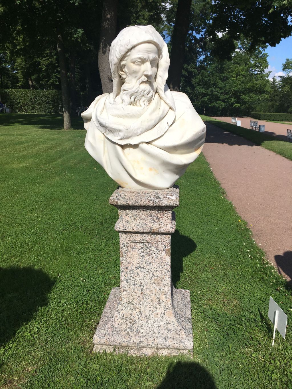 Объемно-пространственное и пластическое решение:бюст «Борей»;подгрудное изображение аллегории северного ветра в виде мужчины с бородой, укутанного драпировки; нач. XVIII в., кон. XVIII в.,белый мрамор.
