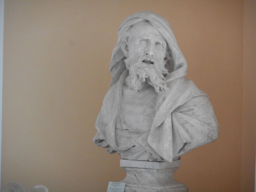Объемно-пространственное и пластическое решение:погрудное изображение пожилого мужчины с бородой и накинутым на голову плащом, голова повернута к левому плечу, аллегория холерика; ножка прямоугольная в сечении с профилировками; XVIII в., белый мрамор (бюст), белый с серыми прожилками мрамор (ножка).