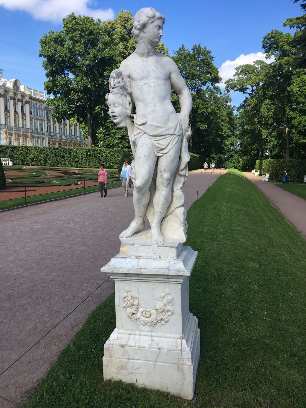 Объемно-пространственное и пластическое решение;круглая скульптура Персея, в виде мужской фигуры с драпировками на бедрах, головой Горгоны Медузы в правой руке; надпись а плинте: «PERCEO»;нач. XVIII в., белый мрамор.