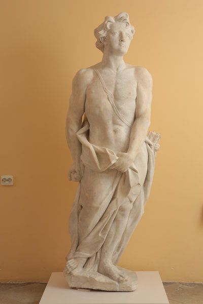 Статуя «Адонис», каскад Драконов, западная сторонастатуя «Адонис»* на плинте (мрамор), установлена на каскаде Драконов с западной стороны (место 4 снизу); мужская фигура выполнена в полный рост; голова приподнята, торс повернут вправо, в левой руке палочка, правой рукой придерживает драпировку, наброшенную на бедра, через левое плечо перекинут ремень, на котором у правого бедра висит колчан со стрелами, левая нога согнута в колене и отставлена назад; основание неправильной формы;* оригинал находиться в интерьерах Большого петергофского дворца.пьедестал известняковый, квадратного сечения, с профилированными карнизом, базой и филенками по граням; техника: рубка, наковка; постамент – известняк.