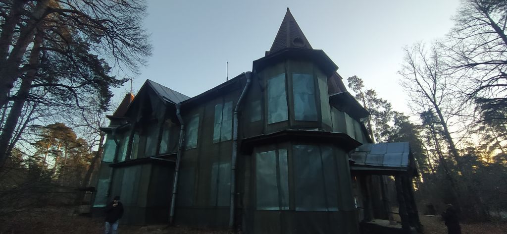 Объемно-пространственное решение: Местоположение, габариты, конфигурация в плане, историческое объемно-пространственное решение двухэтажного здания с угловым ризалитом-«башенкой» в северо-западной части, угловой раскреповкой в северо-восточной части, мезонином в центральной части восточного фасада (исключая позднюю кирпичную пристройку в юго-восточной части); кровля сложной конфигурации, включая шатровую над ризалитом-башней, вальмовую «теремную» над раскреповкой в центре западного фасада и над угловой раскреповкой в северо-восточной части, исторические габариты, высотные отметки конька кровли, вершин кровли над ризалитом и раскреповками;материал кровли – металл; над ризалитом и раскреповками - с имитацией чешуйчатой черепицы;Конструктивная система здания:капитальные стены — бревенчатый сруб; местоположение исторических перекрытий здания;местоположение, габариты, конфигурация (двухмаршевая), конструкция лестницы в юго-западной части здания, материал (дерево) площадок и ступеней, конфигурация ступеней с подступенками; материал и рисунок ограждения лестницы (на деревянных балясинах), поручень (материал – дерево, профиль);деревянные колонны в объёме лестничной клетки – квадратные в плане, с профилированным сдвоенным поясом на уровне поручня ограждения;напротив каждой колонны – деревянные пилястры аналогичного оформления; в центральной части западного фасада – крыльцо: материал (дерево), конструкция (с навесом на 6 столбах) габариты; лестница крыльца: материал (дерево), габариты, конструкция, конфигурация;Архитектурно-художественное решение фасадов:гранитный цоколь;материал и характер отделки фасадной поверхности: обшивка профилированной и непрофилированной вагонкой вертикально, горизонтально и «в ёлочку»; с элементами отделки под фахверк по западному фасаду и в объёме ризалита-«башенки»; контрастный принцип окраски фасада (с выделением наличников);количество, местоположение, габариты и конфигурация оконных проёмов: с трапецевидными (северный, западный фасад, объём многогранного ризалита-«башенки» и угловой раскреповки), треугольным (западный фасад, объём многогранного ризалита) и прямоугольными (по всем фасадам) завершениями;заполнение оконных проемов: материал (дерево), рисунок расстекловки, оформление оконных проёмов: профилированные наличники; местоположение, габариты и конфигурация исторических дверных проёмов в центральной части западного фасада и в объёме угловой раскреповки; материал и характер заполнения: деревянное филенчатое по западному фасаду; деревянное филенчатое с застекленной верхней трапецевидной частью (мелкая расстекловка) – в объёме раскреповки; оформление дверных проёмов: профилированные наличники; подоконный карниз в уровне 1 этажаСеверный фасад:По 1 оси – угловая раскреповка (прямоугольная в плане) под вальмовой «теремной» крышей с кованым украшением округлой формы;карниз в уровне основной кровли; между ним и выносом вальмовой кровли – обшивка вагонокой «вертикально»;по 3 оси – раскреповка в уровне 1 этажа, служащая опорой для фигурных столбиков, поддерживающих вынос кровли мезонина;вынос кровли оформлен декоратвивной конструкцией с аркой и элеменатами пропильной резьбы;в западной части, перед угловой раскреповкой-«башенкой» – оконный проём сложной формы со стр
