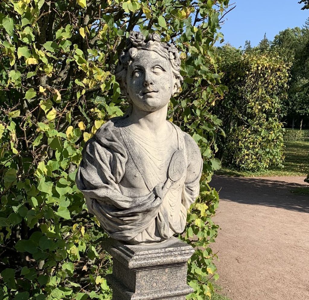 Объемно-пространственное и пластическое решение:аллегория «Апреля» в виде подгрудного изображения мужчины с плащом на плечах, бляхой на ремне с изображением зодиакального знака «Телец», цветами и листьями в волосах;нач. XVIII в., скульптор Д. Бонацца,белый мрамор.