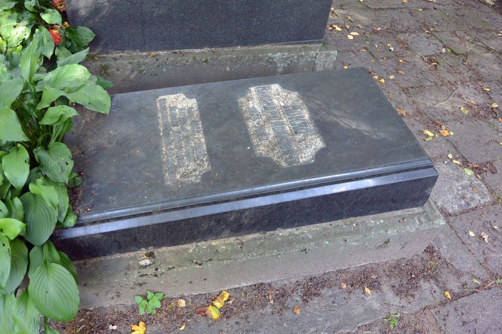 Объемно-пространственное и архитектурно-художественное решение:историческое объёмно-пространственное решение надгробия* в виде прямоугольной в плане профилированнойплиты-саркофага из тёмного гранита на прямоугольном в плане основании-цветнике из известняка, на площадке мощёной бетонными плитами (на верхней наклонной полированной поверхности надгробия вырублена шрифтовая композиция на фоне кованой поверхности);содержание и характерные особенности надгробной надписи.