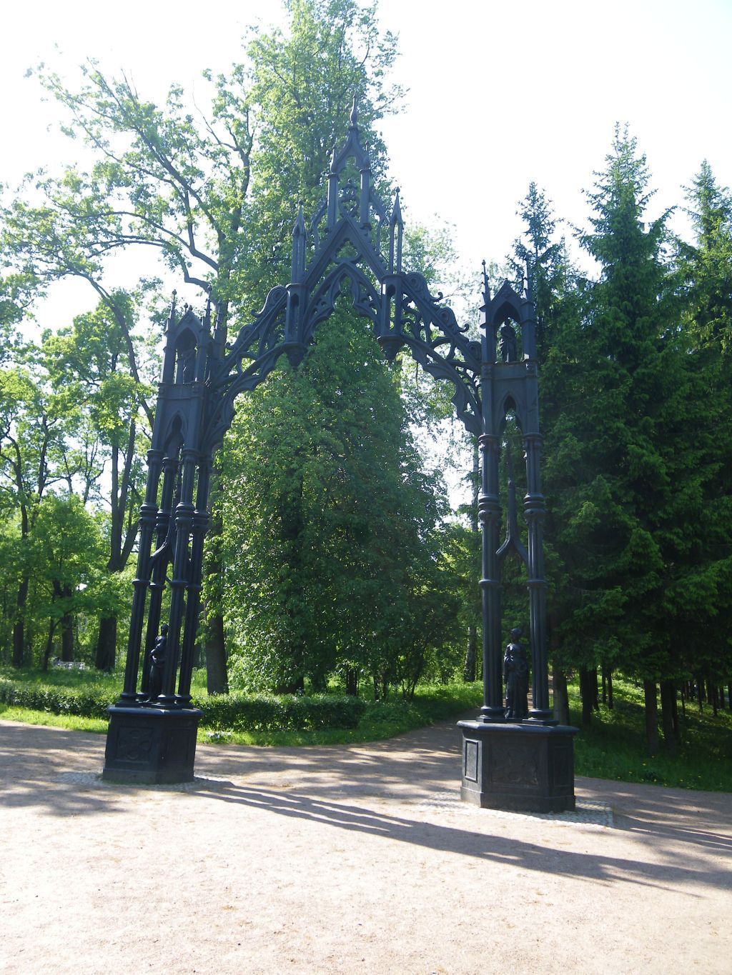 Объемно-пространственное решение:габариты ворот с двумя опорными столбами из четырех стоек на шестигранных основаниях и стрельчатой аркой.Конструктивная система:ворота с двумя опорными столбами и стрельчатой аркой (материал – чугун, техника - литье).Архитектурно-художественное решение:опорные столбы из четырех стоек в виде пучка колонн с перехватами, завершенные стилизованными фиалами, пинаклями, декорированными краббами;стрельчатые арки в виде трилистника между стойками;шестигранные в плане основания с филенками с рельефным декором;стилизованные фиалы между стоек опорных столбов, декорированные краббами;круглая скульптура в фиалах;стрельчатая арка ажурного рисунка со стилизованными пинаклями, волютами, краббами.