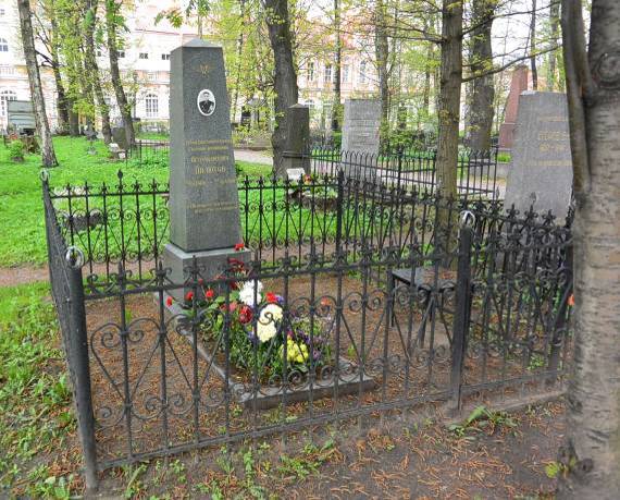 Объемно-пространственное и планировочное решение территории: историческое местоположение в центральной части Некрополя Александро-Невской Лавры (юго-восточная сторона), конфигурация участка (№ 24 на схеме); захоронения в границах участка.Объемно-пространственное и архитектурно-художественное решение:объёмно-пространственное решение надгробия в виде квадратной в плане стелы-обелиска из серого гранита на ступенчатом, квадратном в плане постаменте-основании из серого гранита с примыкающим цветником, ограниченным поребриком из серого гранита; стела-обелиск расположена на земляной площадке внутри металлической ограды (прутья квадратного сечения с пиками и декором в виде стилизованных волют); на лицевой поверхности стелы-обелиска расположено овальное портретное изображение на фото-эмали, на постаменте вырублены и тонированы под золото контррельефные шрифтовые литеры и символы; содержание и характерные особенности надгробной надписи.