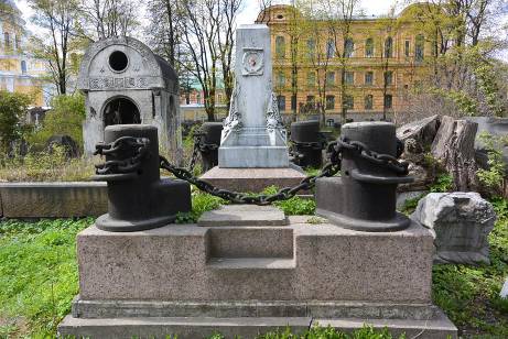 Могила Бутакова Г.И. (1820-1882), адмирала, 1880-е гг. (надгробие), ск. Чижов М.А., 3-й-участок1.Объемно-пространственное и архитектурно-художественное решение:историческое местоположение, габариты и конфигурация участка (семейное место); захоронения в границах участка; надгробие в виде мраморной стелы на ступенчатом пьдестале, декорированном скульптурными изображениями, на основании из розового гранита, внутри семейного захоронения, массивного гранитного поребрика с металлическим ограждением из цепей, закреплённых на массивных корабельных кнехтах; характер и содержание надгробной надписи.