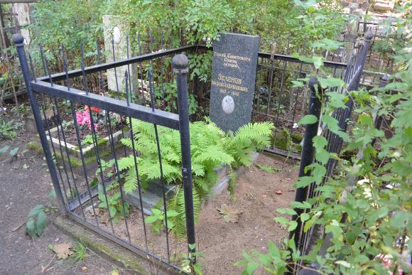 Объемно-пространственное и планировочное решение территории: местоположение захоронения в восточной части Шуваловского кладбища на Школьной дорожке, конфигурация участка (№ 7 на схеме); захоронения в границах участка. Объемно-пространственное и архитектурно-художественное решение:габариты, конфигурация и объёмно-пространственное решение надгробия в виде прямоугольной в плане вертикально поставленной прямоугольной стелы из серого полированного гранита на постаменте того же материала с примыкающим цветником, ограниченным гранитным поребриком на бетонном основании, на лицевой поверхности стелы высечены и тонированы под золото контррельефные шрифтовые литеры надгробной надписи, ниже в помещено овальное портретное изображение на фотоэмали (надгробие расположено на земляной площадке, ограниченной бетонным поребриком с металлической оградой из прутьев круглого сечения с пиками и стоек круглого сечения с навершиями в виде шаров); *содержание и характерные особенности надгробной надписи. * портретное изображение на фотоэмали утрачено