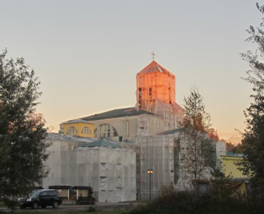 Объемно-пространственное решение:габариты и конфигурация здания с повышенным центральным объемом (церковь) и двухэтажными корпусами; апсида в виде полуротонды с колоннами по центру северо-западного фасада; портик с фронтоном по центру юго-западного фасада; звонница в виде башенки-ротонды в завершении объема церкви; два ризалита на юго-западном фасаде; крыша - габариты и конфигурация (церковь - вальмовая, боковые корпуса - трехскатная с двумя световыми фонарями); материал окрытия (листовой металл). Конструктивная система здания:наружные н внутренние капитальные стены - местоположение и материал (кирпич): исторические отметки перекрытий: колонны с базами из известняка (восемь): световые фонари (два) - габариты. местоположение (нал боковыми корпусами), материал (дерево): тип и местоположение сводов - крестовые и цилиндрические (в помещении церкви); коробовые своды (в боковых корпусах); подпружные арки (в помещении церкви); конха апсиды (в помещении церкви); две лестницы: тип (распашные с забежными ступенями): конструкция (по косоурам): материал ступеней (известняк): ограждения - материал (металл), рисунок.Объемно-планировочное решение:в габаритах внешних и внутренних капитальных стен.Архитектурно-художественное решение:материал и характер отделки фасада гладкая штукатурка: материал и характер отделки цоколя плиты из известняка: оконные и дверные проемы -историческое местоположение, конфигурация (прямоугольные, квадратные, с полуциркульным завершением, тройные полуциркульные) и габариты: оконные заполнения - исторический рисунок и материал (дерево):северо-восточный фасад:апсида - местоположение, габариты, конфигурация (в виде полуротонды): четыре колонны, две полуколонны и два четвертных столба тосканского ордера; антаблемент - архитрав с гулами, фриз с триглифами и метопами, профилированный карниз: профилированный наличник с импостами - местоположение (центральный оконный проема первого этажа апсиды), оформление (замковый камень, прямой профилированный сандрик на кронштейнах в виде волют): межэтажный профилированный карниз в уровне сандрика центрального окна: юго-западный фасад:портик на стилобате с подъемом в четыре ступени, с фронтоном в завершении - местоположение. габариты, конфигурация: четыре колонны и четыре пилястры тосканского ордера: антаблемент портика - архитрав с гулами, фриз с триглифами и метопами, профилированный карниз: фронтон с гладким тимпаном и профилированным карнизом по краю:оформление потолка портика - кессоны с профилировками: дверной проем в прямоугольной нише -конфигурация, местоположение (по центру портика), габариты: две прямоугольные ниши по сторонам от дверного проема; прямоугольные нишн на торцах ризалитов:юго-восточный фасад:дверной проем с профилированным наличником - конфигурация. местоположение (в центральной оси), габариты; крыльцо в четыре ступени -местоположение, конфигурация (полукруглая в алане), габариты: тройное окно - местоположение, конфигурация (полуциркульное с глухими нишами в боковых частях); габариты; северо-западный фасад: тройное окно - местоположение, конфигурация (полуциркульное с глухими нишами в боковых частях); габариты: световые фонари (два) -местоположение (над боковыми частями здания (над лестницами), конфигурация (в виде кубических объемов, завершенные крышей на че