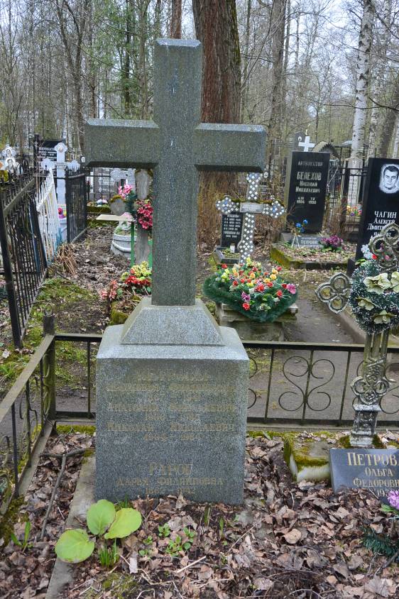 Объемно-пространственное и планировочное решение территории: историческое местоположение в центральной части Серафимовского кладбища к западу от Центральной дорожки, конфигурация участка семейного захоронения (№ 12 на схеме); захоронения в границах участка.Объемно-пространственное и архитектурно-художественное решениегабариты, конфигурация и объёмно-пространственное решение надгробия в виде четырёхконечного креста из серого гранита на прямоугольном в плане постаменте с примыкающим цветником (надгробие расположено на земляной площадке, ограниченной бетонным поребриком с металлическим ограждением, на лицевой поверхности постамента вырублены и тонированы под золото контррельефные шрифтовые литеры надгробной надписи); содержание и характерные особенности надгробной надписи.