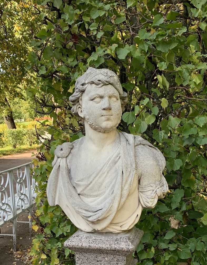 1.Объемно-пространственное и пластическое решение:аллегория «Марта» в виде подгрудного изображения мужчины с бородой, драпировкой на плечах и головным убором с зодиакальным знаком «Овна»; нач. XVIII в., скульптор Д. Бонацца, сер. XVIII в., белый мрамор.