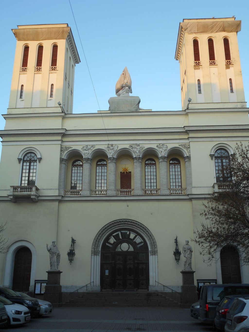 Объемно-пространственное решение: Трехэтажное на подвалах трехнефное здание, прямоугольное в плане, с двумя угловыми двухъярусными башнями, тремя гранитными крыльцами по южному фасаду, с двумя гранитными крыльцами по западному и восточному фасадам; лицевой фасад разделен на два яруса, в нижнем – перспективный портал в центральной части, в верхнем – открытая лоджия с пятью арками; крыши основного объема здания и башен, их исторические конфигурация и габариты, включая высотные отметки коньков и карнизов. 3. Конструктивная система:Фундаменты; исторические наружные и внутренние капитальные стены, их местоположение, материал (кирпич); междуэтажные перекрытия – местоположение; своды, в том числе система крестовых и коробовых с распалубками сводов, опирающихся на пилоны с приставными колонками, крестовые, коробовые с распалубками, на пилонах; система обходных галерей основного объема трехнефного зала – историческое местоположение галерей, конфигурация, габариты; ограждения галерей – историческое местоположение, габариты, материал, оформление; система галерей апсиды – историческое местоположение, конфигурация, габариты; ограждение галерей – историческое местоположение, габариты, материал, оформление; четыре гранитных пилона с гранитными приставными колонками с окрашенными стилизованными капителями, на постаментах (по три колонки у каждого пилона); две пары гранитных* приставных колонок с окрашенными стилизованными капителями, на постаментах;* окрашены межэтажные винтовые лестницы Л-1 и Л-2 с вмонтированными в стены известняковыми ступенями, их историческое местоположение), конфигурация, габариты; историческое литое ограждение – местоположение, материал, техника исполнения, габариты, рисунок (фигурные стойки с завитками); две металлические лестницы с литыми ступенями и подступенками, ведущие с верхней площадки лестниц Л-1 и Л-2 в башни, их местоположение, конструкция, габариты, материал, техника исполнения; исторические ограждения лестниц* – местоположение, конфигурация, рисунок, материал, техника исполнения;* сохранились фрагментарно межэтажные двухмаршевые лестницы Л-3 и Л-4 с известняковыми ступенями по металлическим косоурам, их историческое местоположение, конфигурация, габариты; историческое кованое ограждение – местоположение, материал, техника исполнения, габариты, рисунок (стилизованный геометрический и растительный орнамент); исторические металлические стяжки наружных капитальных стен башен. 4. Объемно-планировочное решение:историческое объемно-планировочное решение в габаритах капитальных стен, сохранившееся на период начала ХХ в. Архитектурно-художественное решение фасадов: материал и характер отделки цоколя – плиты красного гранита в нижней части, известняковые скобы в верхней части; материал и характер отделки фасада – гладкая штукатурка, линейный руст в уровне 1-го этажа центральной части фасада; раскреповки фасадов башен; крыльцо из ступеней красного гранита, его историческое местоположение (центральная часть южного фасада), конфигурация, габариты; историческое ограждение* – местоположение, конфигурация, габариты, материал, техника исполнения, рисунок;*утрачено два крыльца из ступеней красного гранита, с двумя опорными тумбами, квадратными в сечении, на профилированном основании, расп
