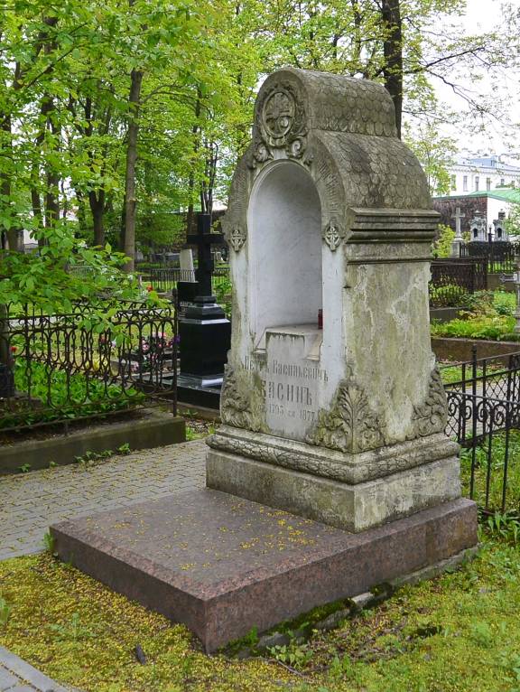 Объемно-пространственное и архитектурно-художественное решение:историческое местоположение захоронения, габариты и конфигурация надгробия; историческое надгробие в виде прямоугольной в плане фигурной профилированной стелы из мрамора на прямоугольной в плане надгробной плите из красного гранита, стела декорирована рельефами символического и растительного характера; рельефные символы, характер и содержание надгробных надписей.