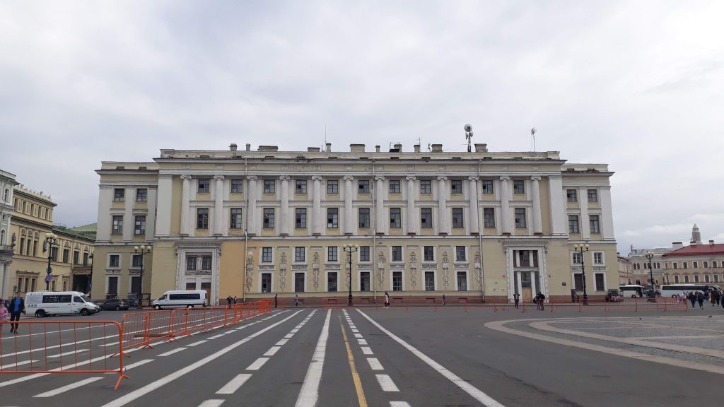 1.Объемно-пространственноерешение:объемно-пространственное решение здания, состоящего из 2-х корпусов, обращенных фасадами на Дворцовую пл.;объемно-планировочное решение двора;габариты, конфигурация крыши, высотные отметки конька, карниза, дымовых труб;Конструктивная система здания:исторические конструкции: исторические наружные и внутренние капитальные стены – местоположение, материал (кирпич); своды, в т.ч. надподвальные, коробовые, в т.ч. с распалубками, крестовые, штукатурные по металлическим балкам (прусские);исторические лестницы (конфигурация, габариты, марши и лестничные клетки известняковой плиты, ограждения чугунного литья);исторические междуэтажные перекрытия помещений с декоративно-художественной отделкой;воротный проезд- местоположение (восточный фасад), габариты;парадная лестница помещения II-Н: (79,7 кв.м)местоположение, габариты, конфигурация (одномаршевая, средистенная);ступени известняковой плиты, профиль ступеней;парадная лестница помещения IV-Н (41,5 кв.м.), VI-Н (47, 6 кв.м.), VIII-Н (49,6 кв.м.), IX(50,3 кв.м.): (ведет с 1-го по 4-й этаж)местоположение, габариты, конфигурация (двухмаршевая), с промежуточными площадками;ступени известняковой плиты с валиком по краю;лестничные площадки облицованы керамической плиткой геометрического рисунка;ограждение из литых прутков, круглых в сечении, с элементами в виде балясины в центре и по краям, стянутых верхней тетивой;поручень деревянный с профилем;своды штукатурные по металлическим балкам (прусские), с декором из штукатурных тяг и лепных розеток -в завершении лестничного проема и лестничных клеток;подшивка лестничных маршей штукатурная, со сдвоенной штукатурной рамой по периметру и лепными розетками по углам. В центре профилированная лепная розетка; сдвоенные штукатурные рамы с лепными розетками по углам по стенам лестничного проема;лестничная площадка 4-го этажа:внутриоконная рама – материал (дерево, окрашена), оформление (верхняя часть створок фестонированная).лестница 12-Н:(ведет из подвала по 4-й этаж)местоположение, габариты, конфигурация (двухмаршевая), с промежуточными площадками;ступени известняковой плиты ;ограждение из кованых прутков, квадратных в сечении, стянутых верхней тетивой и волютообразными контрфорсами;поручень деревянный с профилем;крестовый свод в завершении лестничного проема;лестница 9-Н: (ведет из подвала по 4-й этаж)местоположение, габариты, конфигурация (двухмаршевая), с промежуточными площадками;ступени известняковой плиты;ограждение из кованных прутков квадратных в сечении, стянутых верхней и нижней тетивой;поручень деревянный с профилем;3.Объемно-планировочноерешение:объёмно-планировочное решение лестниц и помещений с архитектурно- художественной отделкой;4.Архитектурно-художественное решение фасадов:архитектурное решение и декоративное оформление фасадов в стиле классицизм;цоколь раскрепованный, облицован гранитной скобой; характер и материал отделки – окрашенная штукатурка (рустованная в уровне 1-го-2-го этажа, гладкая в уровне 3-го-4-го этажа);первоначальный колер окраски (по результатам натурных и историко-архивных исследований);оконные проемы- местоположение, габариты, конфигурация (прямоугольные на уровне цокольного, 1-ого- 4-ого этажей, включая оконные проемы дверных порталов);рисунок расстекловки, материал (дерево) и цвет оконны