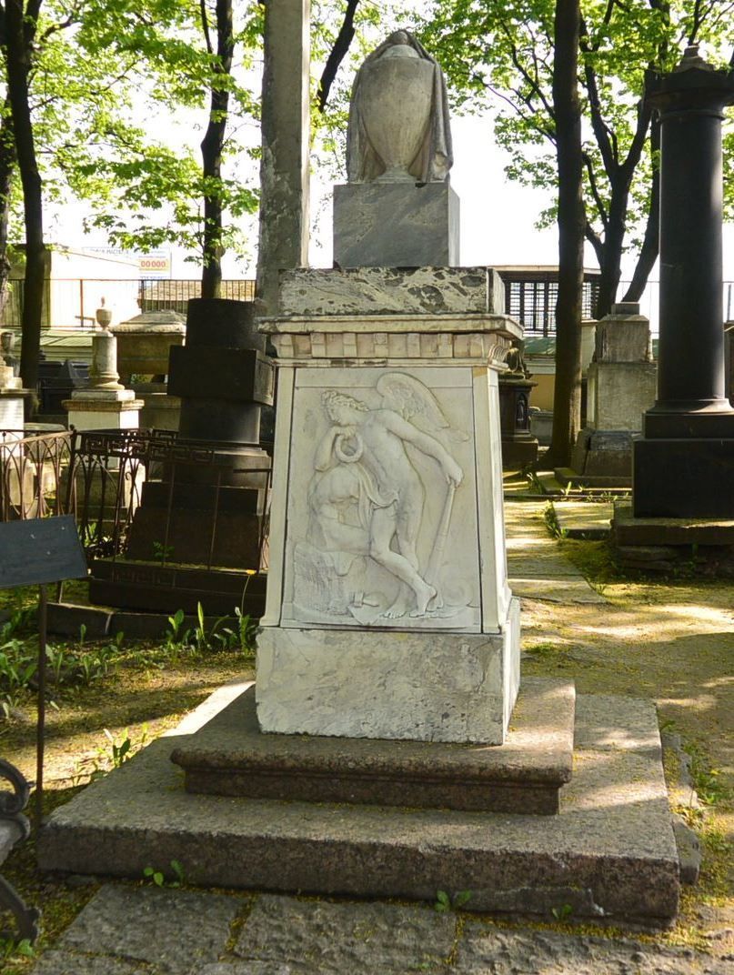 Объемно-пространственное и архитектурно-художественное решение: местоположение захоронения, габариты и конфигурация надгробия; авторское художественное решение в виде каменной траурной вазы на высоком мраморном постаменте, декорированном рельефным портретным медальоном, рельефом с изображением крылатого гения с потухшим факелом и рельефом в виде профилированного карниза с дентикулами, на ступенчатом гранитном основании; характер и содержание надгробных надписей.