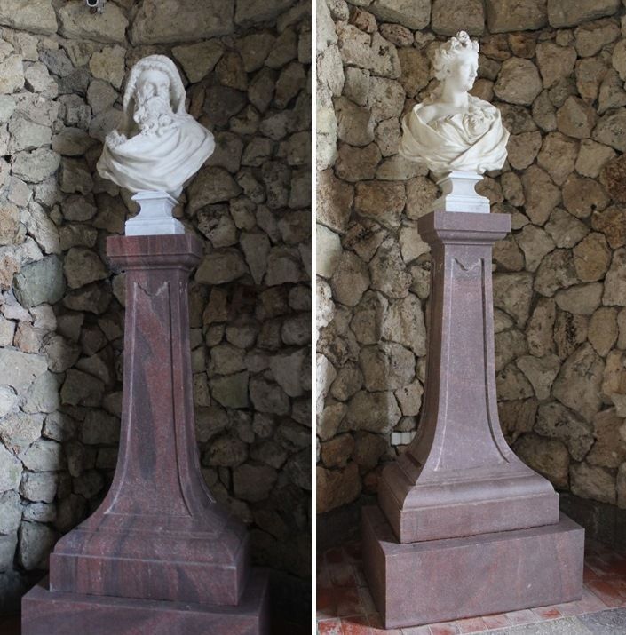 погрудный бюсты «Весна»* (мрамор), волосы собраны и опускаются на грудь, тело прикрыто драпировкой, бюст установлен на фигурной подставке круглого сечения с профилированным цоколем;погрудный «Зима»** (мрамор), на голову и тело накинута драпировка, бюст установлен на фигурной подставке круглого сечения с профилированным цоколем.*,** в нишах на террасе у Малого грота установлены копии бюстов «Весна» и «Зима» из искусственного мрамора, оригиналы установлены в Нижнем гроте.пьедесталы* (известняк): в форме четырехгранной балясины, сужающейся кверху, с вогнутыми гранями, профилированными цоколем и карнизом.* установлены под копиями бюстов на Верхней террасе.