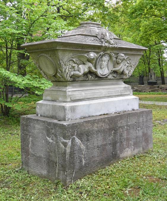 Объемно-пространственное и архитектурно-художественное решение:историческое местоположение захоронения, габариты и конфигурация надгробия (семейное захоронение); историческое художественное решение надгробия в виде прямоугольного в плане мраморного саркофага декорированного рельефами и горельефами портретного, фигурного, символического, геральдического и растительного характера на прямоугольном в плане высоком основании из известняка; характер и содержание надгробных надписей.