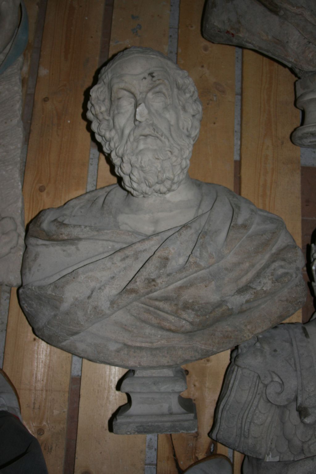 1.Объемно-пространственное и пластическое решение:Бюст Гомера; подгрудное изображение бородатого мужчины с драпировкой на плечах; ножка квадратная в сечении, профилированнаяматериал – белый мрамор;XVIII в.