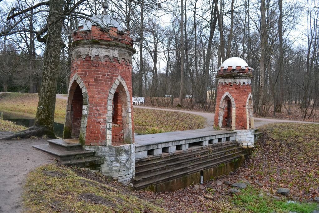 Объемно- пространственное и планировочное решение территории: местоположение на протоке между Большим и Верхними прудами близ Рамповой аллеи.Объемно-пространственное решение:плотина-каскад с двумя сужающимися к верху башенками по прибрежным краям плотины; конфигурация и габариты плотины и башенок с купольными завершениями; материал окрытия башенок – металл;ступенчатый каскад. Конструктивная система сооружения:плотина каменная со ступенями каскада, облицованными известняковыми блоками, и береговыми устоями, являющимися цоколем башенок;переход над порогом водослива из гранитных плит с гранитными элементами-водоразделителями;кирпичные стены башенок; купольные своды в башенках.Архитектурно-художественное решение фасадов:архитектурно-художественное решение в приемах неоготики; материл облицовки ступеней каскада – гранит;материал облицовки цоколя башенок (устоев) – известняк;материал стен башенок – красный кирпич;стрельчатые ниши со щелевидными оконными проемами по сторонам башенок, по внешним сторонам с входными проемами;крыльца в две ступени перед входами в башенки; известняковые рустованные обрамления ниш и проемов;облицовка полов в башенках – известняковые плиты;широкий известняковый декоративный фриз и профилированный известняковый карниз;зубчатый парапет с водосливами;купольное завершение башенок с фигурным навершием.