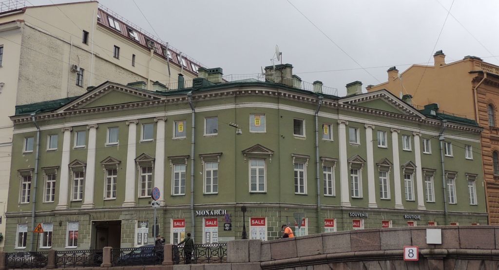 Объемно-пространственное и планировочное решение территории:местоположение и градостроительные характеристики здания, его акцентная роль в композиционно-планировочной структуре квартала и в панораме набережной реки Мойки и Зимней канавки;Объемно-пространственное решение:габариты трехэтажного на подвалах здания, сложного в плане, образующего с дворовыми флигелями один внутренний двор и выходящего фасадами на наб. реки Мойки и наб. Зимней канавки;конфигурация и габариты крыш, включая высотные отметки коньков и карнизов;воротный проезд – историческое местоположение, конфигурация (прямоугольный), габариты;Конструктивная система: исторические наружные и внутренние капитальные стены, их местоположение, материал (кирпич);междуэтажные перекрытия –местоположение; пологий свод воротного проезда;исторические лестницы, в том числе:многомаршевая межэтажная парадная лестница на пилонах, на крестовых и полуциркульных с распалубками сводах – с известняковыми ступенями, балюстрадным ограждением (гладкие опорные столбы) и профилированными поручнями;профиль ступеней (с валиком);покрытие полов лестничных площадок – лещадная плита;двухмаршевая межэтажная межстенная лестница в западном дворовом флигеле - с известняковыми ступенями;профиль ступеней (с валиком);полуциркульные своды под лестничными площадками;Объемно-планировочное решение:историческое объемно-планировочное решение в габаритах капитальных стен;Архитектурно-художественное решение фасадов:лицевые фасады, их историческое и архитектурно-художественное решение в формах классицизма;известняковый цоколь с валиком;характер отделки фасадов: окрашенная штукатурка (прямоугольный руст – 1-й этаж);оформление воротного проезда – веерная рустовка, замковый камень;фасады здания оформлены двумя пилястровыми портиками в уровне 2-го и 3-го этажей, с треугольными фронтонами, первый этаж рустован, оконные проемы - с профилированными наличниками, треугольными и прямыми сандриками на фигурных орнаментированных кронштейнах;скругленная угловая часть фасада с раскреповкой;исторический профиль межэтажных карнизов и тяг;исторические оконные проемы 1-3-го этажей – местоположение, конфигурация (прямоугольные), габариты,заполнения оконных проемов – исторические рисунок, материал (дерево), цвет;венчающий раскрепованный антаблемент: профилированный карниз с поясом «сухариков», гладкий фриз, профилированный архитрав;архитектурно-художественное решение дворового фасада:известняковый цоколь;материал и характер отделки фасадов - окрашенная штукатурка (прямоугольный руст 1-го этажа);исторические оконные проемы 1-3-го этажей – местоположение, конфигурация (прямоугольные, полуциркульные), габариты, оформление (веерная рустовка, профилированные наличники);заполнения оконных проемов – исторические рисунок, материал (дерево), цвет;исторические дверные проемы, ведущие на лестницы – местоположение (вторая ось по западному фасаду, внутри воротного проезда), конфигурация (прямоугольные), габариты, оформление (веерная рустовка, профилированные наличники);деревянное глухое двустворчатое заполнение воротного проезда;металлическое двустворчатое заполнение вороного проезда;прямоугольный, со скругленными углами ризалит на высоту 1-3-го этажей;исторический профиль межэтажных карни
