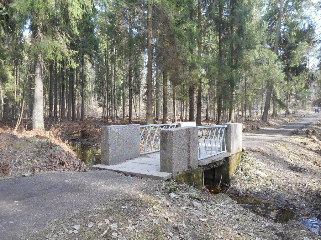 Объемно-пространственное и архитектурно-художественное решение: однопролетный мост, его местоположение (на «аллее Адольфа» (по плану границ № 10), конфигурация, габариты, материал (опоры – гранит, известняк, покрытие моста – гранитные плиты);скрытые и внешние конструкции устоев и пролетного строения, их исторический материал (натуральный камень);ограждение, решенное в виде литой чугунной решетки готического рисунка между прямоугольных в плане тумб розового гранита, его конфигурация, габариты, материал, техника исполнения, рисунок.