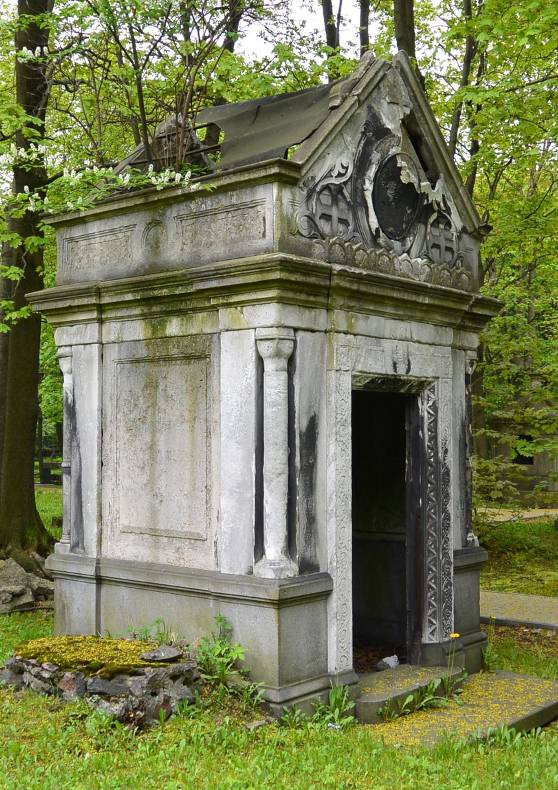 Объемно-пространственное и архитектурно-художественное решение:историческое местоположение захоронения, габариты и конфигурация надгробия (семейное захоронение); историческое архитектурно-художественное решение надгробия в виде прямоугольного в плане склепа-усыпальницы из естественного камня , надгробие выполнено в классических формах с высоким профилированным и раскрепованным цоколем на бутовом основании, порталом, стилизованными колоннами на углах, антаблементом, расположенным над ним четвериком с двумя двускатными щипцами с люкарнами, венчающим профилированным карнизом и двускатной металлической кровлей по металлическим прогонам, аритектурные элементы склепа декорированы резными рельефами символического, растительного, орнаментального и шрифтового характера; рельефные символы, характер и содержание надгробных надписей.