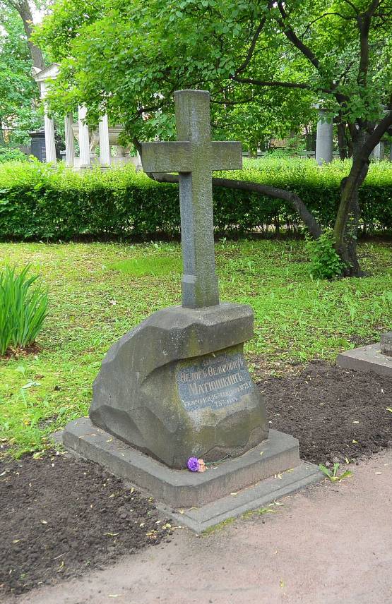 Объемно-пространственное и архитектурно-художественное решение:историческое местоположение захоронения и конфигурация надгробия; историческое решение надгробия в виде каменного креста с основанием в виде «Петровской горки» из серого гранита на прямоугольном в плане со скошенными углами постаменте из того же материала; характер и содержание надгробных надписей.