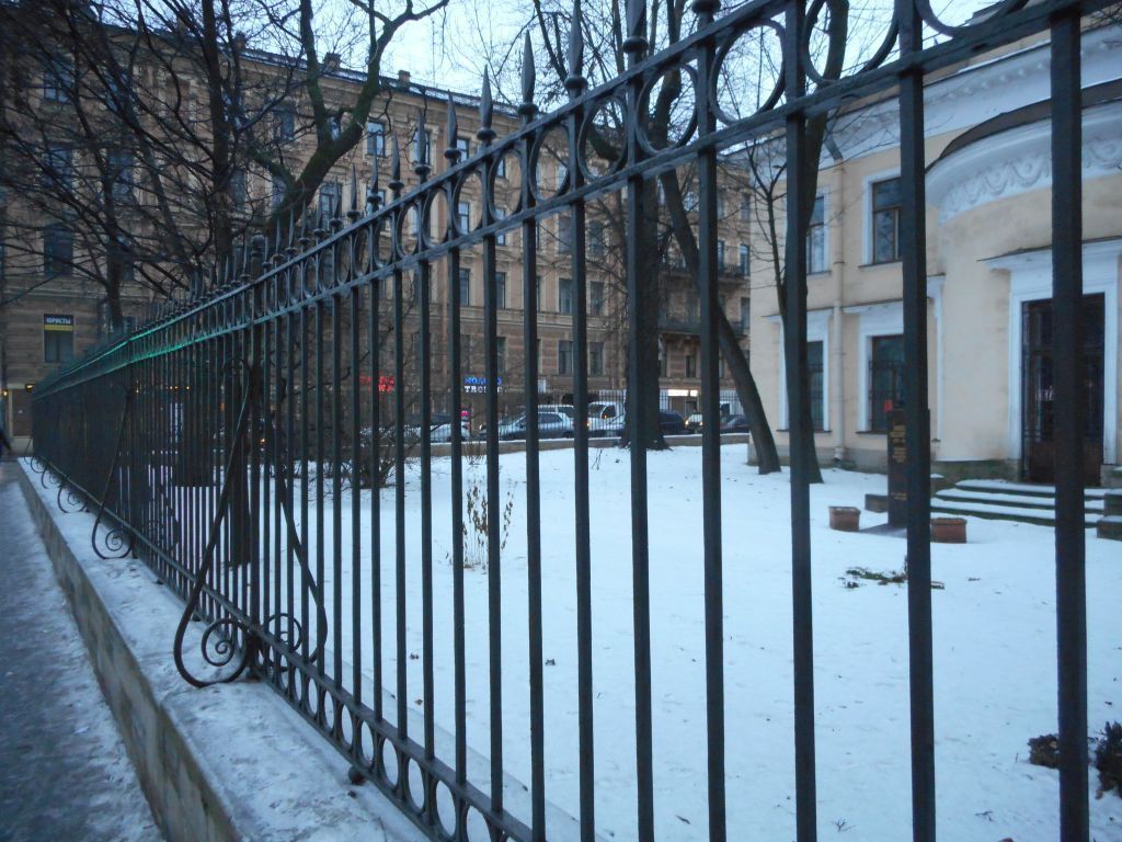 Объемно-пространственное решение:историческое местоположение (по красным линиям Московского проспекта и 4-й Красноармейской улицы), габариты, конфигурация. Конструктивная система:опорные стойки с секциями, калиткой и воротами.Архитектурно-художественное решение:металлическая решетка на цоколе, облицованном известняком с опорными стойками, фланкированными волютами с двух сторон;ограда состоит из идентичных секций: металлические стойки квадратного сечения с пикообразным завершением, в верхней и нижней частях с поясом из колец.