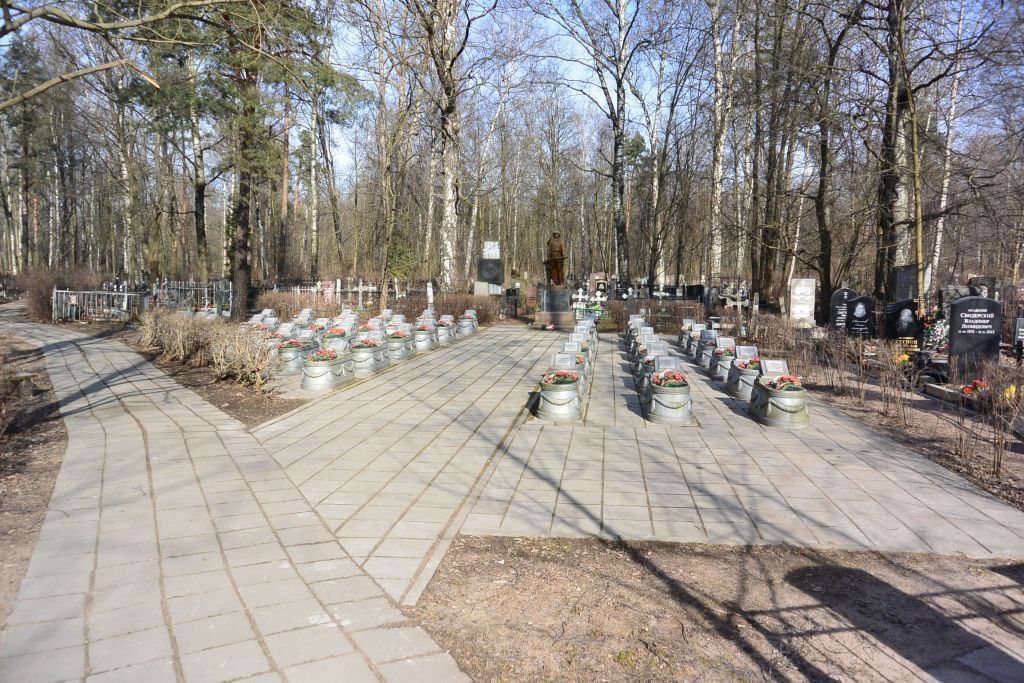 Объемно-пространственное и планировочное решение территории: историческое местоположение в южной части Богословского кладбища у Лабораторного проспекта, габариты и конфигурация в плане братского захоронения (№ 4 на схеме); захоронения в границах участка;историческое планировочное решение (основные элементы планировки территории): - местоположение памятника «Воин» в северной части участка;- конфигурация участка, местоположение надгробных мемориальных раковин;- конфигурация в плане и габариты дорожек, формирующих планировочную композицию мемориала и разделяющих мемориальные раковины;- посадки кустарника по периметру мемориала;- историческое местоположение элементов мемориала, исторически сложившиеся визуальные связи между ними. Объемно-пространственное и архитектурно-художественное решение:архитектурно-художественное решение мемориала и составляющих его элементов: - авторское решение скульптуры из бетона (солдат, держащий в опущенных руках автомат), на прямоугольных в плане пьедестале из красного гранита и ступенчатом основании; - габариты, конфигурация, рисунок рельефного декора раковин и изголовий, вид материала (бетон); символы, характер и содержание памятных надписей на памятнике и изголовьях раковин.