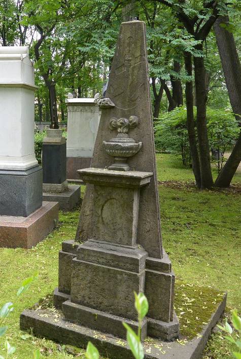 Объемно-пространственное и архитектурно-художественное решение:историческое местоположение захоронения и конфигурация надгробия; историческое художественное решение надгробия в виде трёхгранного профилированного обелиска из песчанника, на лицевой поверхности которого расположена профилированная подставка с навершием в виде рельефного мраморного светильника с пламенем, выше – углубление от утраченного рельефа (изображением креста, якоря и гирлянды), на лицевой и боковых гранях обелиска остались овальные углубления от утраченных медальонов; рельефные символы, характер и содержание надгробных надписей.