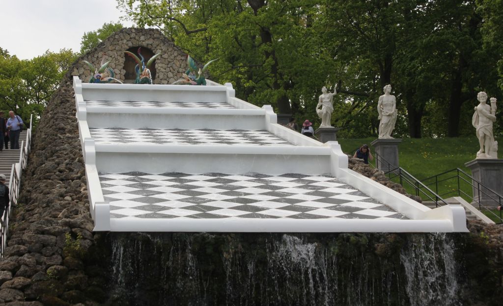 Объемно-пространственное решение:историческое местоположение (в восточной части Нижнего парка), габариты и конфигурация, высотные отметки грота; композиционное решение: центральная каскадная лестница в 4-е пологих сливных плато, фланкирована деревянными лестницами, у подножия центрального каскада фигурный бассейн, барочной формы; каскад завершен гротом с одноарочным проемом и воротами.Конструктивная система фонтана:историческая система конструкций каскада:наружные и внутренние кирпичные капитальные стены;сводчатые перекрытия, внутренние арочные проемы;водопадный каскад (лестница из 4-х пологих сливных плато) – местоположение, конструкция (деревянные настилы, по деревянным балкам), тип, материл (кирпич, дерево), глухое деревянное парапетное ограждение обито железными листами, облицованное туфовым камнем в виде высоких откосов;две боковые лестницы – местоположение (расположены симметрично относительно оси водопадного каскада), конструкция, тип, материал ступеней и площадок согласованных с террасами уступов земляных склонов восточной и западной сторон каскада;арочный грот – местоположение (в завершении каскада на верхней террасе), материал (кирпич), оформление (облицован туфовым камнем, с полуциркульным арочным проемом и закрыт декоративной дверью, расписанной в виде накладок);арочный грот – местоположение (в основании каскада на нижней террасе), материал (кирпич), облицован туфовым камнем, решетка – материал (металл).Объемно-планировочное решение:историческое объемно-планировочное решение внутренних помещений Каскада Драконов.Гидротехническое и архитектурно-художественное решение:архитектурно-художественное решение барочного монументально-декоративного сооружения, объединяющего в себе фонтан с каскадной лестницей, мраморными скульптурами и двумя гротами;оформление водопадного каскада – пологие сливные плато раскрашены в черные и белые квадраты (шахматный рисунок), фигурный деревянный парапет, обит металлом и окрашен в белый цвет; в завершении каскада грот, облицованный туфовым камнем – местоположение (в центральной части в завершении каскада), конфигурация, габариты, в завершении грота, была установлена бронзовая скульптура орла с расправленными крыльями* перед гротом установлены три фонтанных скульптуры Драконов;* скульптура утрачена в 1941-1945гг.фигурный бассейн с профилированным кордоном – местоположение (у подножия каскадной лестницы перед нижним гротом), конфигурация (барочной формы), габариты, материал (натуральный камень), дно чаши бассейна – натуральный камень, чаша бассейна облицована туфовым камнем; в центральной части бассейна была установлена бронзовая скульптурная группа «Сатир и Нимфа»* на прямоугольном постаменте;* скульптура утрачена в 1941-1945гг.исторический рисунок и высота фонтанных струй фонтана;статуя «Помона»* на плинте (мрамор), установлена на каскаде Драконов с западной стороны (место 2 снизу), женская фигура выполнена в полный рост, голова повёрнута к левому плечу, волосы собраны на затылке в узел, на голове венок из фруктов, торс откинут влево и назад, левой рукой прижимает к левому бедру рог изобилия, наполненный фруктами и цветами, в правой руке, согнутой в локте и прижатой к правому бедру, держит два яблока, опирается на правую ногу, выставленную вперед, левая нога, согну