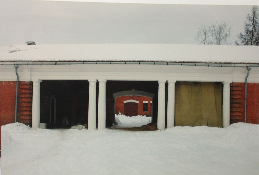 Конюшенный корпусМежозерная ул., д.7, литера БОбъемно-пространственное решение:габариты и конфигурация четырех одноэтажных объемов, которые образуют замкнутый внутренний двор;крыша – габариты (включая высотные отметки), конфигурация;дымовые трубы;Конструктивная система здания: наружные и внутренние капитальные стены;воротный проезд южного фасада;Объемно-планировочное решение:историческое объемно-планировочное решение;Архитектурно-художественное решение фасадов:материал отделки цоколя – известняк; материал и характер отделки фасадной поверхности - сочетание неоштукатуренного кирпича и гладко оштукатуренного декора, выделенного белым цветом;оконные проемы – историческое местоположение, габариты, конфигурация (овальные), обрамление (гладкие наличники и замковые камни);дверные проемы – историческое местоположение. габариты, конфигурация;сдвоенные колонны круглого сечения с дорическими капителями оформляют проезд во внутренний двор; лопатки, фланкирующие проезд и оформляющие углы здания, декорированные рустом;венчающий карниз.